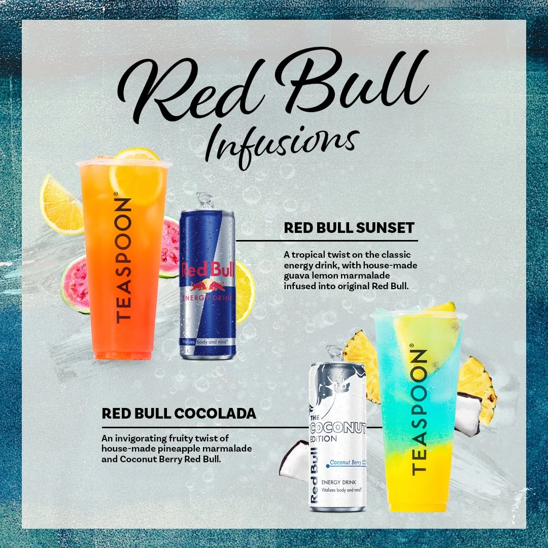 2023 - Teaspoon partnered with Red Bull to showcase two of their products, original Red Bull and Coconut Berry Red Bull, with the release of two limited time offer drinks - The Red Bull Sunset and Red Bull Cocolada.